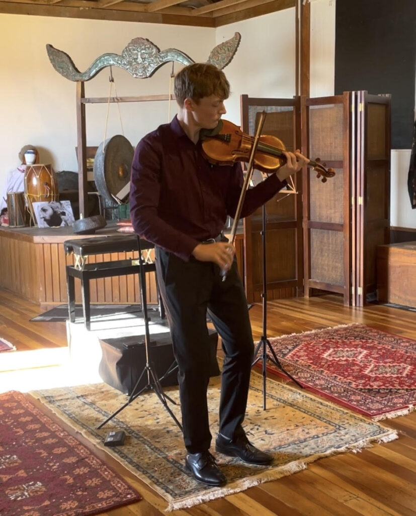 First up was music representing a kind of timely antidote to Aotearoa New Zealand’s present version of Trumpish madness, two Micro-Trios by Ross Harris, written during the much-discussed lockdown period of 2020 for the Pohl/Gjelsten family members present today. The two works, as if conceived with different personalities in mind, displayed contrasting characters, the first beginning in a restless, slightly anxious 5/4 which developed more forthright impulses befitting a kind of “confused turmoil of being” in response to the isolated circumstances. The second work took a more lyrical approach, with long-linked lines attracting all kinds of impulses which attached themselves to the lines before dropping off the pace and wandering quizzically through unfamiliar vistas (like an ageing process, perhaps – with apologies to the composer!).