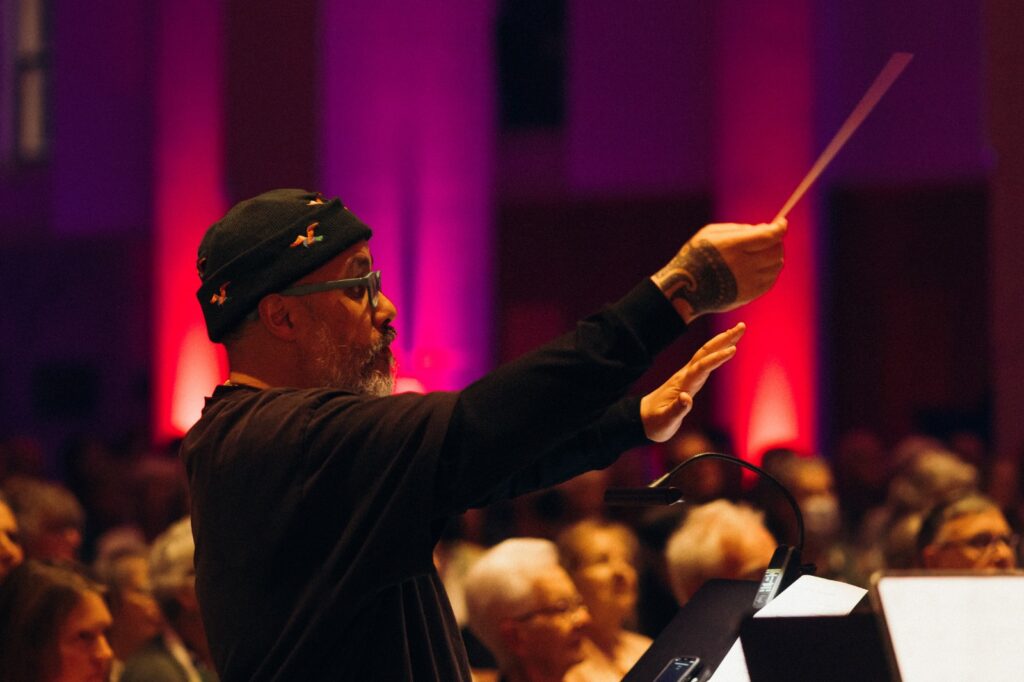 The Karakia is delivered, sonorously and scalp-pricklingly, augmented with impressively sonorous, even baleful-like trumpet tones from the taonga puoro players – others join in from the surrounding areas, with the sounds taking on a less confrontational, more “inclusive” kind of ambience as we begin to discern voices amongst the instrumental sounds. Gradually the voices were made manifest by the singers’ one-after-the-other appearance from the back and up the central aisle to the front, as the instrumentalists continued with their all-enveloping array of sounds from all precincts of the nave. It was an enchanting cornucopia of sound, in constant swirling flux, unexpectedly reminding me at this point of those “river sounds” which build up in the same way in Wagner’s Prelude to his opera “Das Rheingold”.